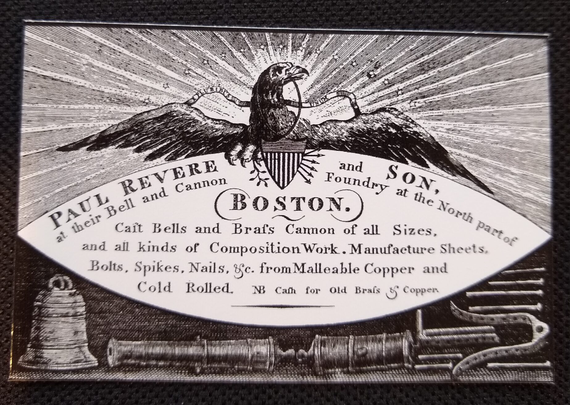 3″ by 2″ rectangular sticker with image of Paul Revere and Son’s Bell and Cannon Foundry trade card. Black and white.